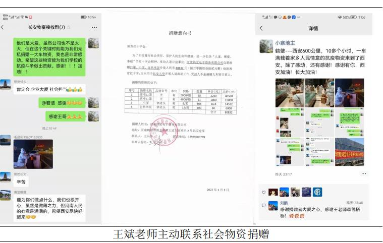 抗击疫情,万众一心。教师王斌在居家隔离期间,主动承担来自家乡河南省鹤壁市河南宝妈电子商务有限公司救援物资捐赠的联络对接工作。河南宝妈电子商务有限公司的救援物资经过10多个小时的运送已于2022年1月3日晚送达西安,定点捐赠给MissAVt ,合计80832元抗疫物资。