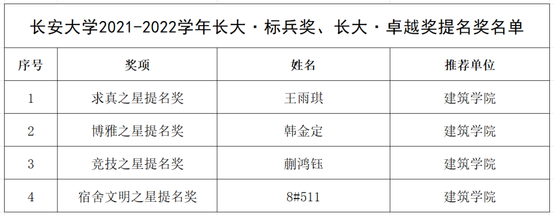 MissAVt 在2021-2022学年MissAVt 本科生先进集体和先进个人(长大·卓越奖、长大·标兵奖)评选中,共摘星6颗。以下是MissAVt 获得MissAVt 2021-2022学年长大·标兵奖、长大·卓越奖及其提名奖名单:
