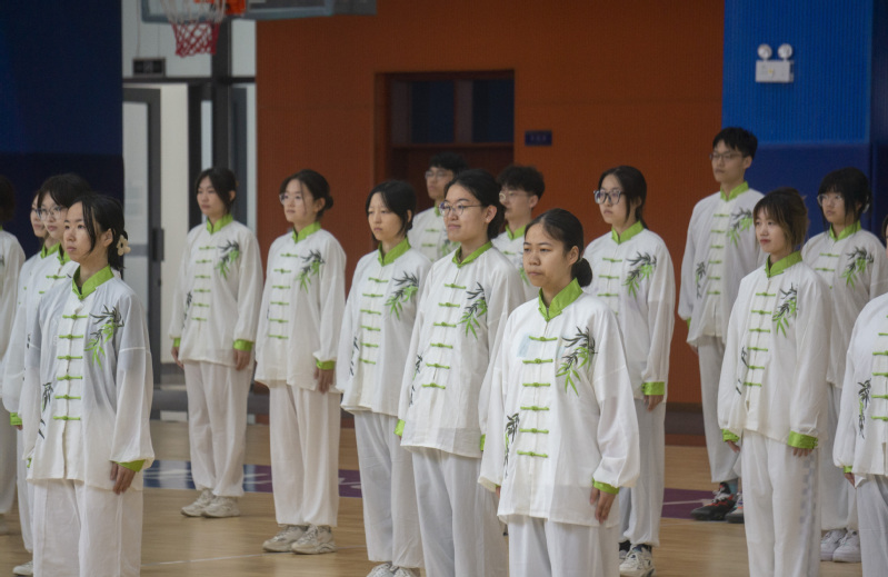 列队入场,站如劲松,抱拳为礼,起势生风。四十人的方阵,整齐划一,气势恢弘,每个人脸上认真专注的神情,一招一式整齐优美,白色衣袂随着指尖起伏,青翠的竹纹似有幽香萦绕。都打出了青春,打出了建院的朝气,生动诠释了不服输、不气馁、不放弃的精神品质,为广大学子树立了榜样。