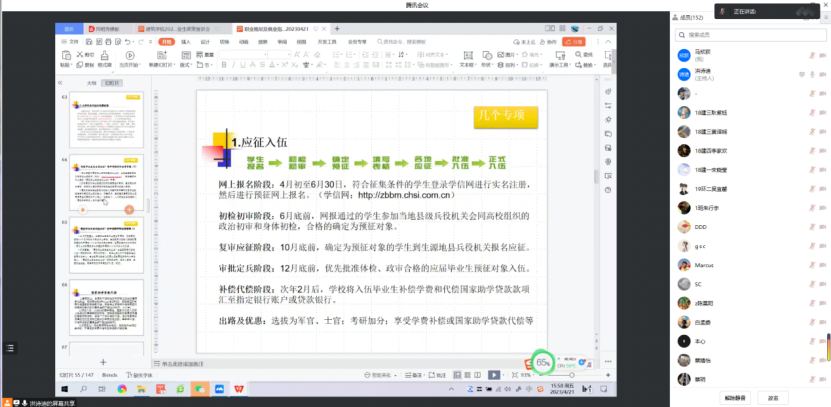 最后,学办主任洪诗迪作为2023届辅导员,从“就业季时间安排”“往届就业考研情况”等方面给各位同学解读了我国当前的就业政策,普及了就业系统的填报以及升学档案转寄等流程,介绍了“西部计划”以及“入伍征兵”等机会,鼓励同学们投身我国西部建设和军队建设,为祖国奉献自己的力量。同时洪老师建议找工作的同学们要抓紧六月份之前珍惜毕业前最后的找工作机会,并及时确定下来。