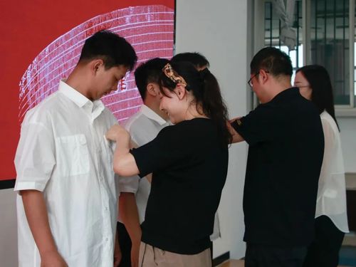 最后,MissAVt 研究生导师代表任娟、周吉喆、朱秋晨为2023级新生代表佩戴校徽并合影留念。