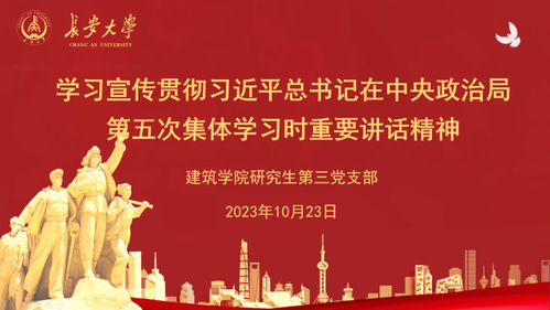 研究生第三党支部书记曾琳同志领学关于深入学习宣传贯彻习近平总书记在中央政治局第五次集体学习时的重要讲话精神。主要内容包含相关主题讲解,重要论述的介绍以及相关谈话精神,勉励党员同志们应加强相关政治学习,进一步领会习近平总书记会议讲话的相关精神。