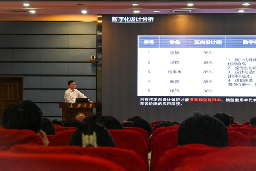 严石副院长以《当前形势下设计师的数字化转型》为题,讲述了建筑行业剧变背景下的从业现状以及数字化技术在行业内应用现状,具体剖析了“数字化”的定义及三层理解,并结合“设计师+建造师”管理模式,指出要通过数字化手段,打破行业壁垒将建造前置到设计阶段,让设计深入到施工阶段实现虚拟建造前置于实体建造,从视线设计师、建造师信息共享、各施所长、协同作战。