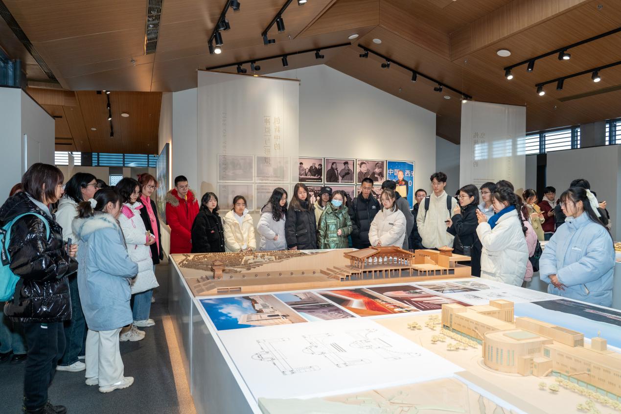 随后,专业讲解员带领同学们参观了张锦秋院士馆,馆内展示了张锦秋院士在建筑领域的杰出贡献——西安钟鼓楼广场、陕西省图书馆和美术馆、黄帝陵祭祀大殿、大唐芙蓉园、曲江遗址公园、中国佛学院教育学院等。馆内布置简洁大方,每一件展品都凸显出学术严谨和创新精神。张锦秋院士在建筑设计以及传承、创新和弘扬中华建筑文化等方面取得了突出成就,成为中国建筑界的一面旗帜,设计的众多精品佳作,为新型城镇化建设贡献了不朽力量。通过参观,同学们深切感受到了张院士对建筑事业的执着与热爱,也对中建西北院在科技研究方面的不懈追求有了更深刻的理解。