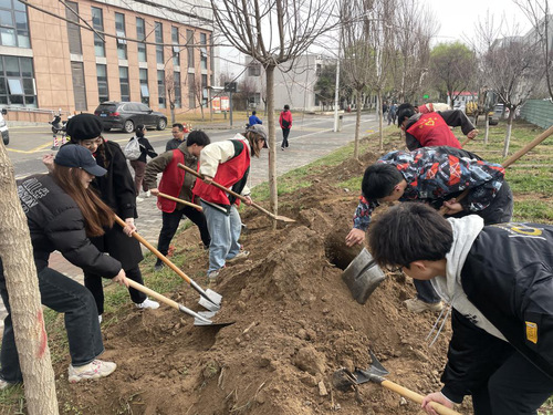 在后勤处老师的指导下,同学们有序地加入植树活动。大家迎春风,踏黄土;挥锹铲土,培实新芽;扶直苗木,播种希冀。各个环节衔接有序,同学们配合默契,每一道工序都认真完成。在大家的共同努力之下,新栽的树苗在春风中昂然挺立,焕发出勃勃生机。