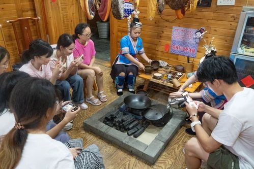 接着,实践队跟随驻村书记来到当地的民俗文化体验馆,体验了非物质文化遗产“侗族打油茶”和款待贵客的习俗“高山流水”,并品尝了百草汤等当地特色菜品。队员们围坐在火炉旁,聆听侗族阿妹讲解食材寓意,观看油茶制作过程,感受侗族人民的淳朴与热情。