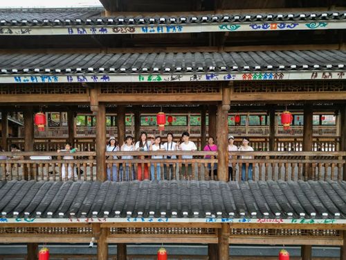 在吴书记的带领下,实践队员依次参观了鼓楼、鸟巢、风雨桥等当地特色民族传统建筑,并观赏了侗族歌舞与大歌,深切感受了侗族独树一帜的民族文化魅力。其中,风雨桥作为侗族建筑的瑰宝,巧妙融合了桥、廊、亭之精髓,其设计之独特,工艺之精湛,令人叹为观止。风雨桥精妙绝伦的结构不仅展现了榫卯技艺的巅峰造诣,更被誉为“榫卯抵承梁柱体系之壮丽典范”,实践队员漫步桥上,由衷赞叹其非凡技艺。