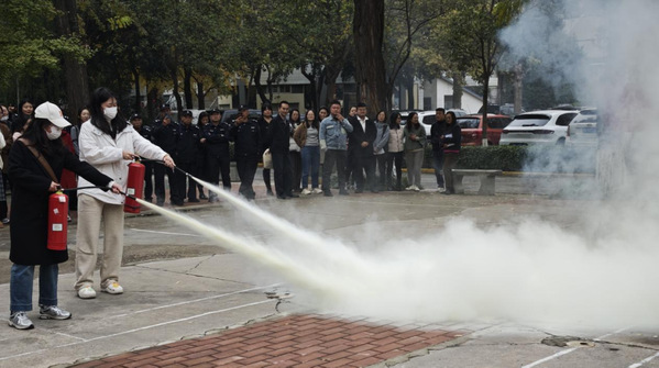 消防技能教学环节,保卫处工作人员详细讲解了灭火器的种类、适用范围以及操作步骤,现场演示了灭火器的正确使用方法,邀请师生们实操练习,手把手带教确保每位师生都能掌握正确的使用方法。通过实际操作,师生们不仅学会了如何正确使用灭火器,还提高了应对火灾的应急处置能力。