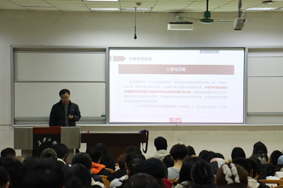 随后,王博老师就最新的学籍管理规定进行了详细解读。他从课程修读、成绩管理、毕业审核、专业分流等多个方面进行了全面阐述,并结合具体案例,分析了常见的问题及解决办法。他特别强调了学籍信息变更的流程和时间节点以及转专业的具体条件,提醒同学们务必在规定时间内完成相关手续。